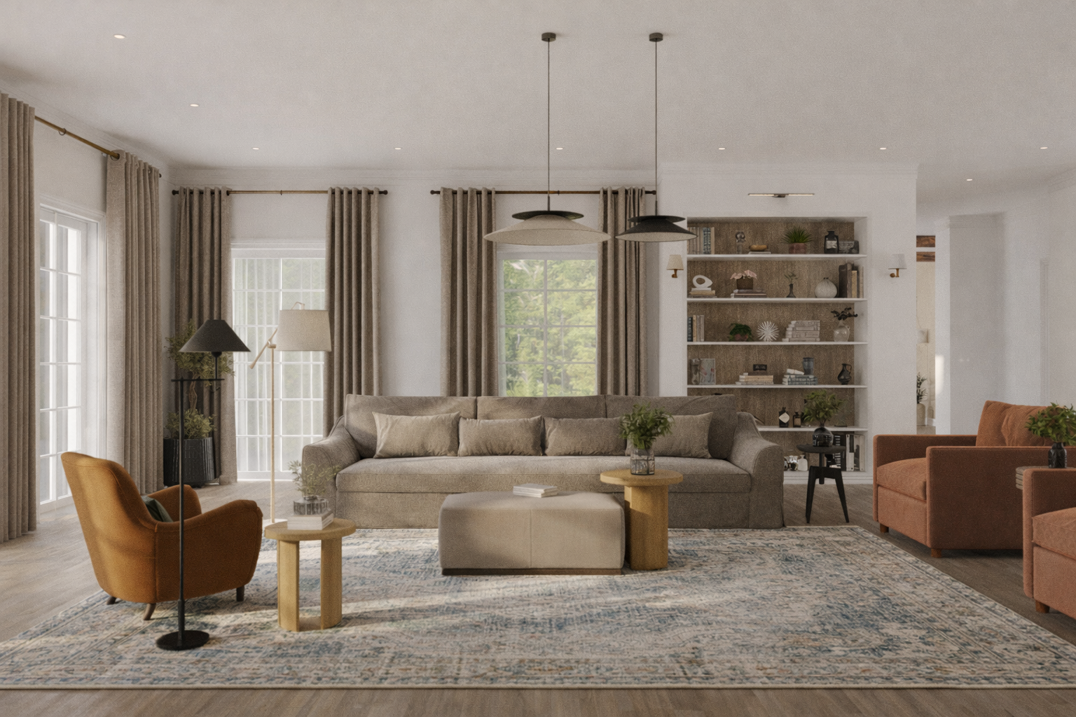 • Large living room windows may be framed with drapery panels